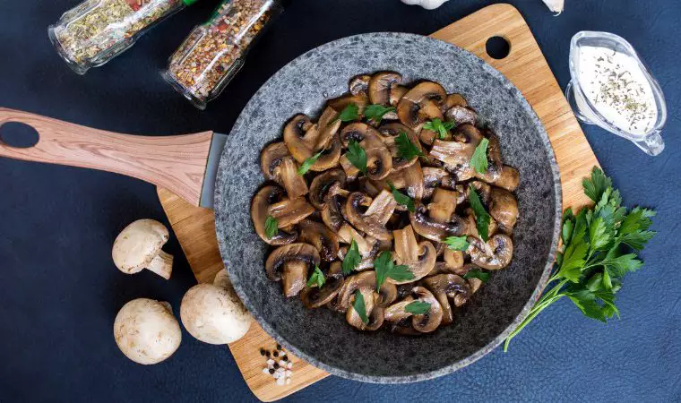 - Em uma panela pequena aqueça o restante do óleo em fogo médio e refogue os cogumelos por 2 minutos ou até ficarem macios.
