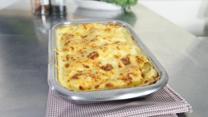 - Coloque os rondellis em uma assadeira untada com azeite e adicione o molho vermelho e o branco por cima.